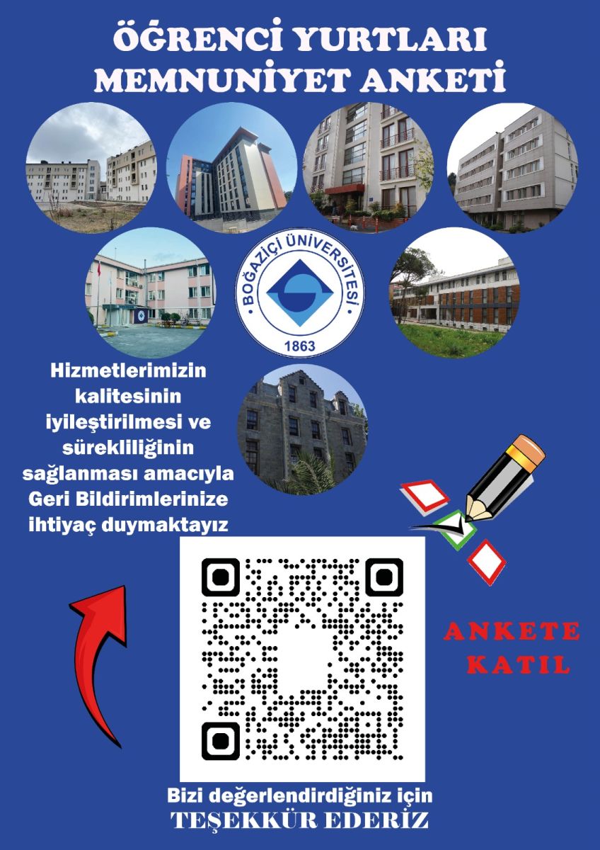 - Yurtlarda Kalan Öğrenciler İçin Genel Memnuniyet Anketi’ne belirtilen linkten ulaşabilirsiniz: https://buform.bogazici.edu.tr/app/form?id=vswZeQ